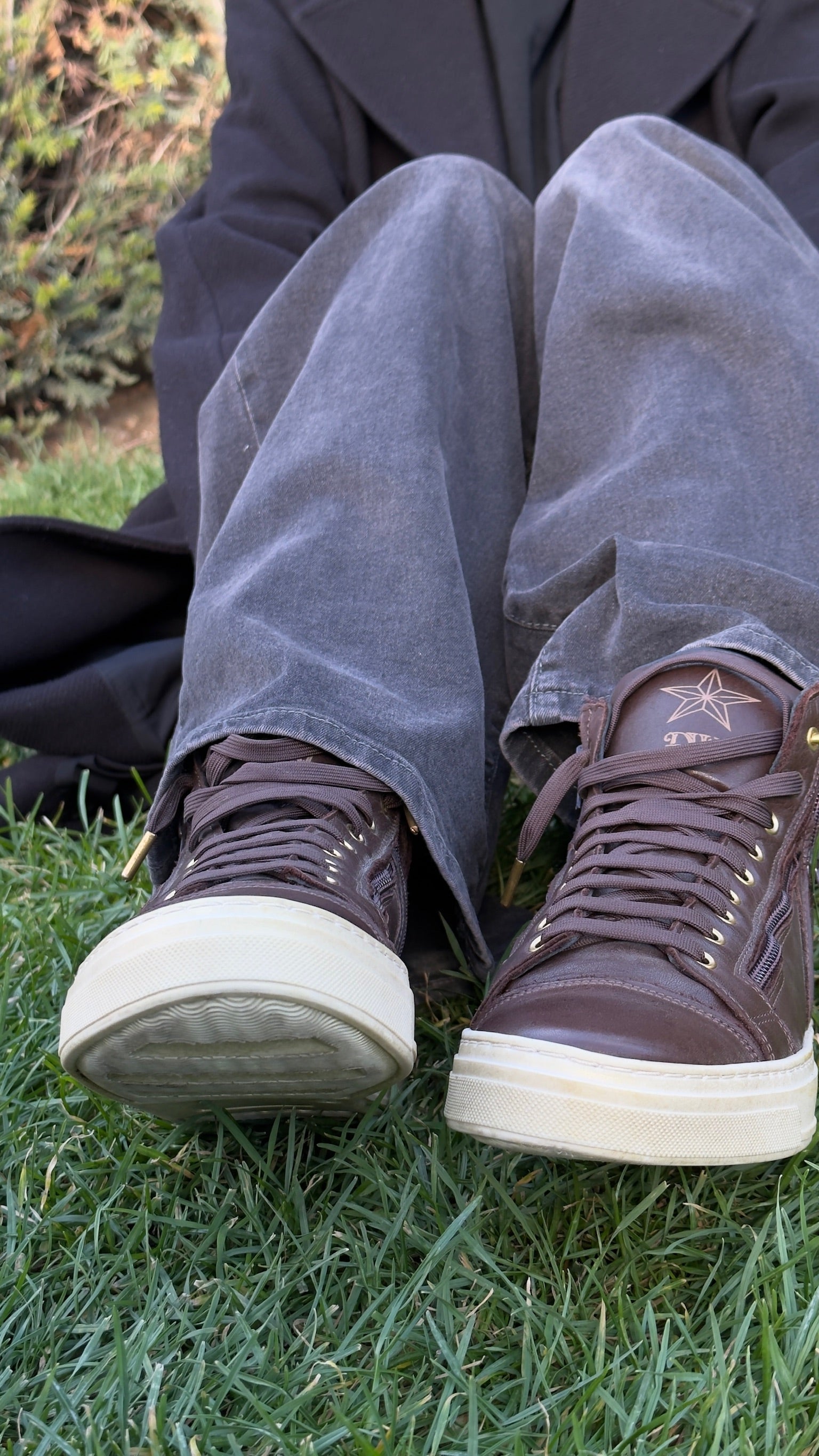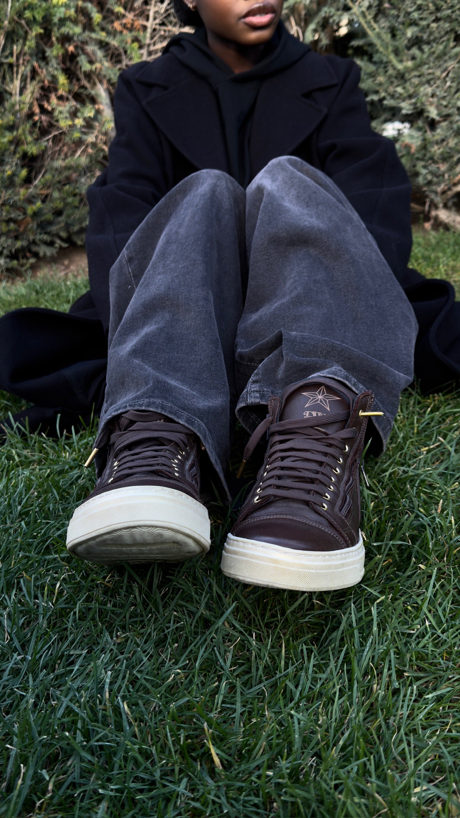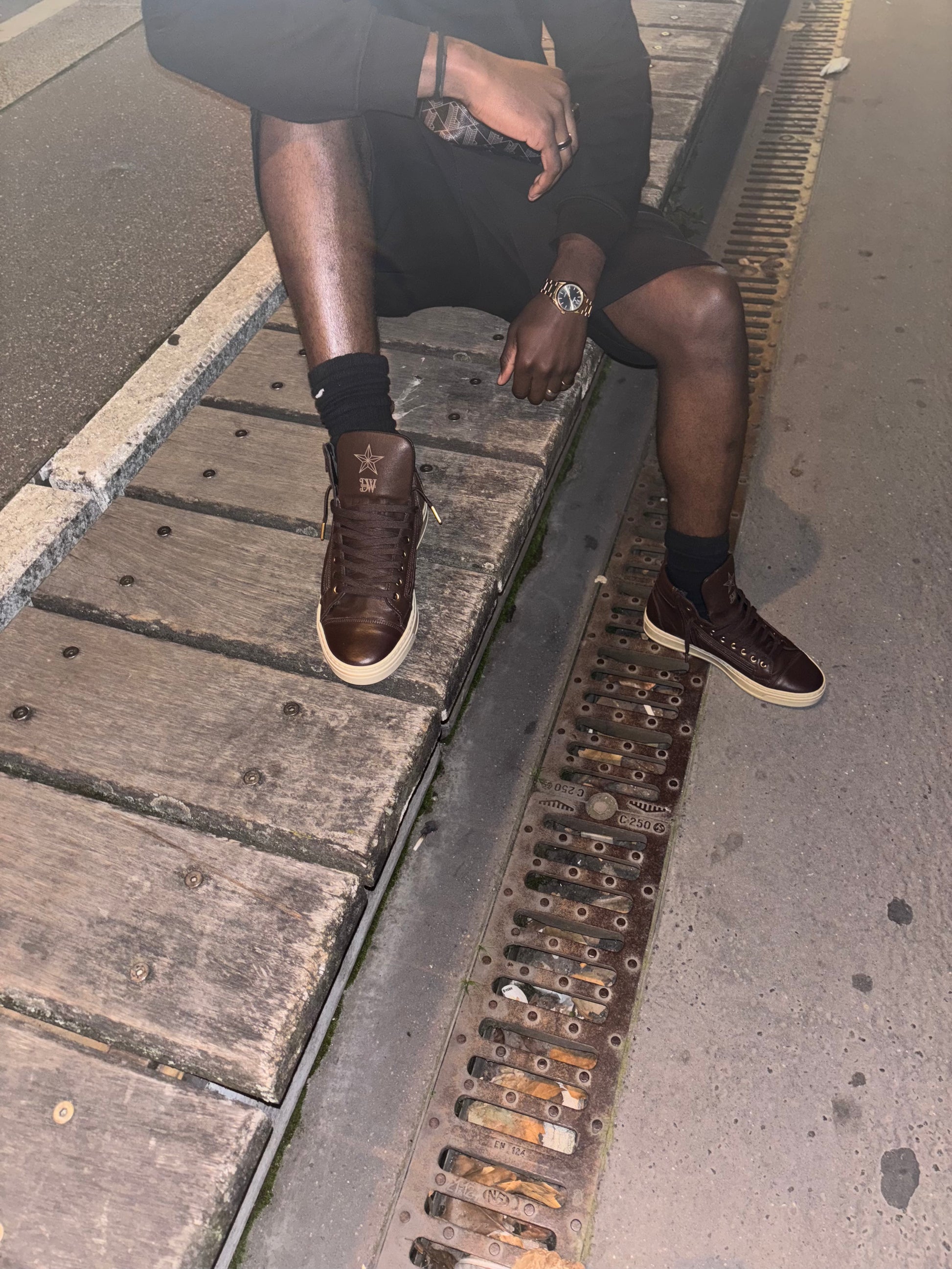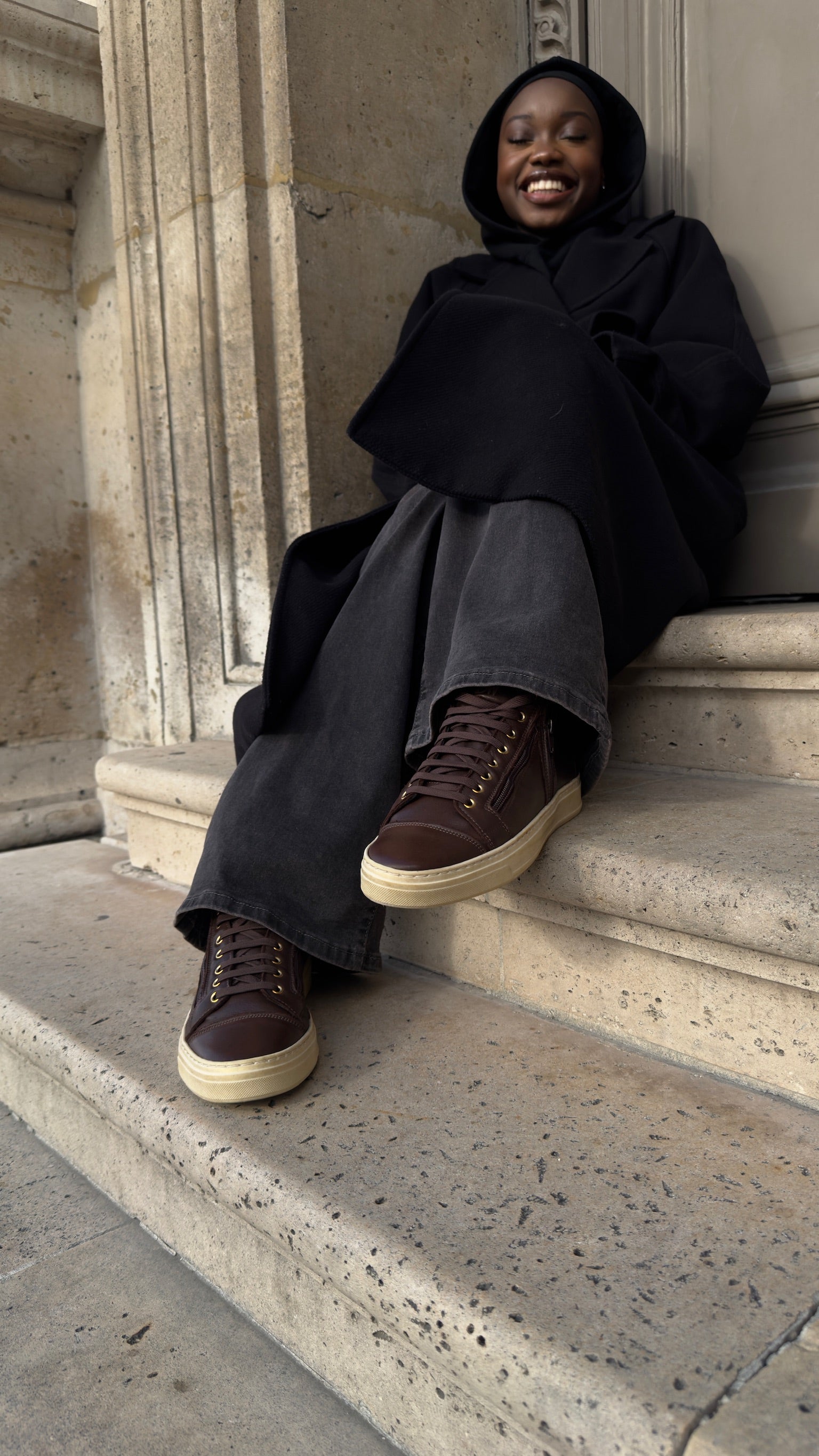 Chaleureuse et polyvalente, la version marron chocolat met en valeur la noblesse du cuir italien. Les détails dorés et la semelle ivoire gold fumé apportent une touche luxe.